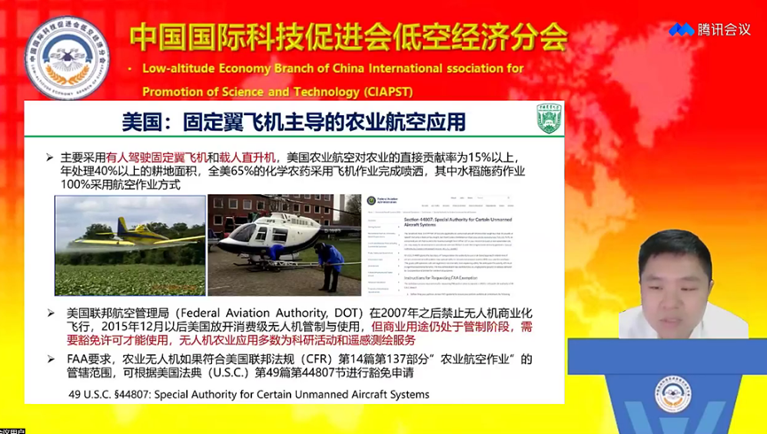 “低空经济百家谈”第三期直播圆满成功2025年1月2日晚,中国国际科技促进会低空经济分会(以下简称“科促会低空经济分会”)主办的首期“低空经济百家谈”第三期成功直播,为低空经济领域的交流与合作搭建了一座崭新的桥梁,吸引了众多业内人士的目光与参与。 “低空经济百家谈”作为低空经济领域的知识盛宴,汇聚了来自企事业单位、科研院所的领导、专家、学者以及科研技术人员等行业精英担任主讲人。他们将围绕低空经济领域的前沿技术、创新产品、发展趋势以及科研成果等核心话题,展开一系列公益性的宣讲活动,旨在打通低空经济产业上中下游的沟通壁垒,促进资源对接与协同发展,为低空经济的繁荣注入源源不断的活力。 “低空经济百家谈”直播活动受到中国国际科技促进会低空经济分会高度重视。中国国际科技促进会低空经济分会常务副会长兼秘书长李井龙先生、副秘书长王娇女士等多位领导观看了直播。 本期直播主持人由中国国际科技促进会低空经济分会副秘书长李崇峻先生担任。李秘书长指出党的十八大以来,以习近平同志为核心的党中央坚持把解决好“三农”问题作为全党工作的重中之重,坚持农业农村优先发展,我国从农业大国加快向农业强国迈进。随着低空经济的发展,无人机在农业生产中的使用规模逐渐加大;在提高生产效率、降低劳动强度、减少农药使用、促进智慧农业发展等方面有突出表现。