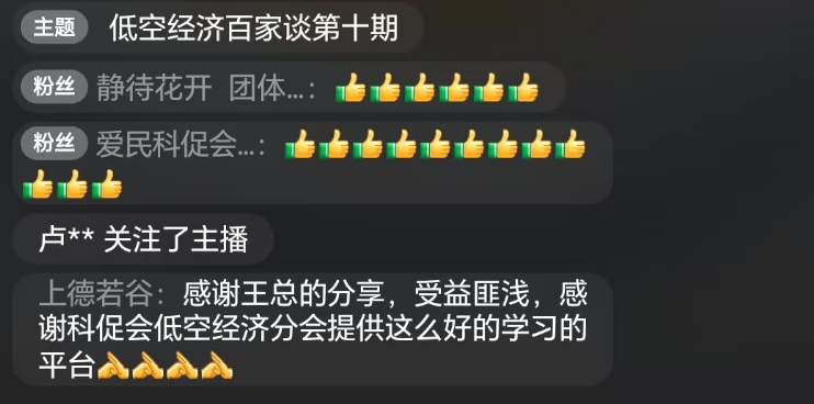 直播结束后,部分观看者在直播间或微信公众号上留言,纷纷留言表达对“低空经济百家谈”直播活动的认可,以及对科促会低空经济分会表示感谢! 我们热烈祝贺“低空经济百家谈”第十期直播取得圆满成功的同时,我们诚挚地欢迎各界同仁、低空经济上中下游的企事业单位、科研机构以及机关院校踊跃参与到“低空经济百家谈”以及科促会低空经济分会未来举办的各类论坛、培训、展会等活动中来。让我们共同携手,深化交流,加强信息共享,在科促会低空经济分会这个坚实的平台上,为低空经济的蓬勃发展添砖加瓦,共同绘就低空经济大发展的宏伟蓝图! 科促会低空经济分会的活动信息将在低空经济网、科促会低空经济分会微信公众号等相关媒体平台上持续发布,敬请各位行业同仁密切关注,共同把握低空经济发展的每一个精彩瞬间! 中国国际科技促进会低空经济分会是由低空经济领域上、中、下游超百家企事业单位共同发起成立的,以促进低空经济发展为己任,推动低空经济领域内的科技创新、产业链、供应链、科研机构对接合作,打造低空产业全维度协同共享的平台。 旨在搭建政府、科研院所、企事业单位沟通的桥梁,推动技术研发、科技成果评价及转化、学术交流、标准化建设、人才培养、产业合作、投融资服务、政策咨询、国际交流合作,促进行业健康发展。