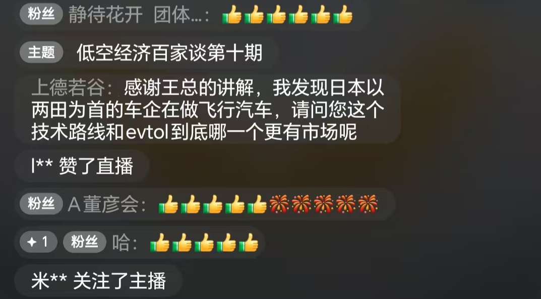 本期活动通过科促会低空经济分会微信视频号面向社会公开直播,现场气氛热烈异常,近千名各界朋友同时在线,纷纷为“低空经济百家谈”直播间点赞;众多专家、学者和企事业单位领导积极参与互动交流,各抒己见,从不同的专业视角出发,针对低空经济的发展提出了诸多宝贵的建议和意见,形成了一场思想碰撞的盛宴。部分网友通过科促会低空经济分会视频号纷纷提问,王智总经理逐一耐心解答。这场交流,不仅拓宽了视野,更深化了对eVTOL 在低空消费中的场景应用方面的认识,为未来的合作与发展奠定了良好的基础。